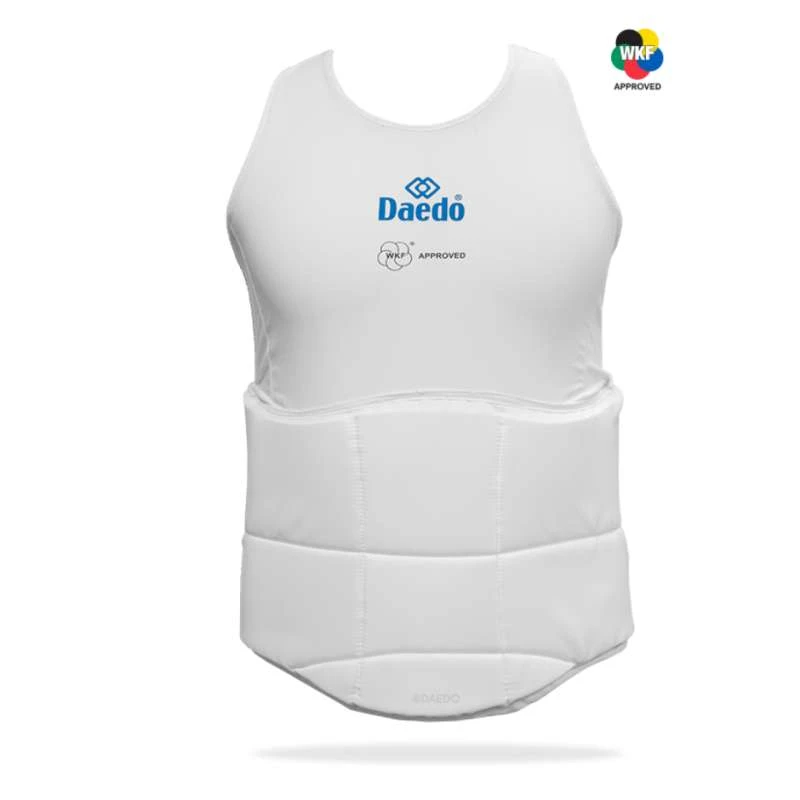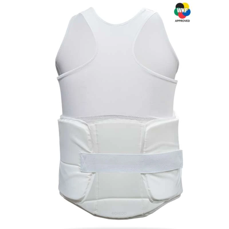 Caractéristiques: dossard et bretelle Daedo senior femme en mousse en bas pour protéger les côtes et le ventre, partie supérieure (T-shirt/top) en polyester élastique et fermeture velcro en bas. La partie supérieure est indissociable de la partie inférieure. Homologué par la fédération mondiale de karaté. LE PROTÈGE POITRINE EN PLASTIQUE N’EST PAS INCLUS.