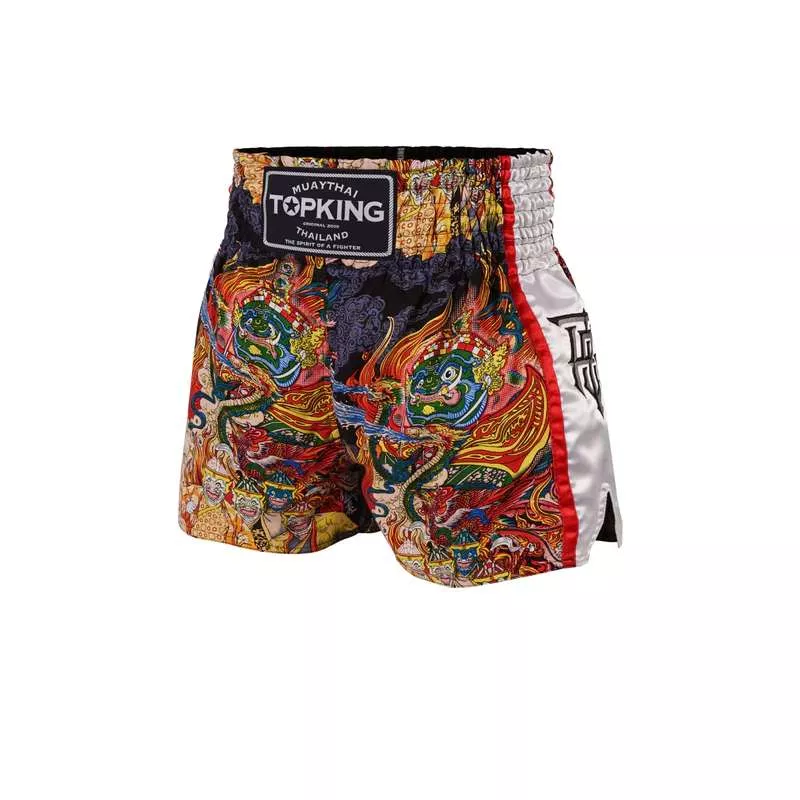 Caractéristiques : Le pantalon de muay thaï Top King TKS 205 blanc est fabriqué en satin et se distingue par son impression originale par sublimation inspirée de la culture thaïlandaise. Ceinture élastiquée avec étiquette centrale de la marque et cordon de serrage intérieur pour un meilleur ajustement à la taille. Coupe courte et ajustée traditionnelle thaïlandaise. Bandes latérales blanches avec le nouveau logo de la marque. Ce modèle de pantalon muay thai est unisexe et fabriqué en Thaïlande.