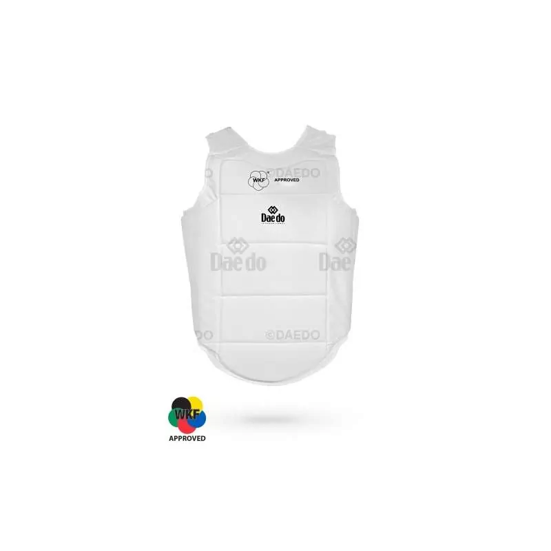 Caractéristiques : plastron de karaté Daedo en acrylique et polyester avec fermeture élastique à l’arrière pour s’adapter au mieux au corps. Homologué par la WKF, il est très confortable et léger. Son utilisation est obligatoire pour les adultes pour les compétitions de Kumite. Une autre caractéristique de ce produit est son excellent rapport qualité-prix.