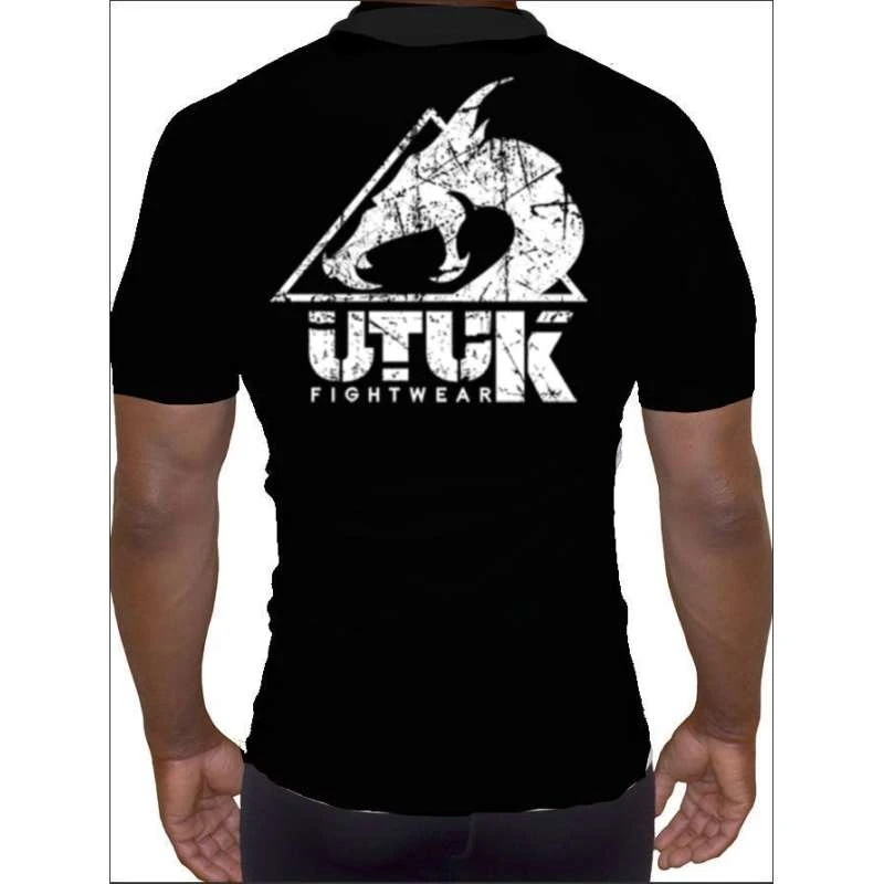 Caractéristiques: Utuk Fightwear lycra composé de 80% de polyester et 20% de spandex de haute qualité, pour garantir une performance maximale lors de vos entraînements intenses ou de vos compétitions plus exigeantes. Rashguard en noir avec des détails blancs. Col rond et manches courtes. Très confortable.
