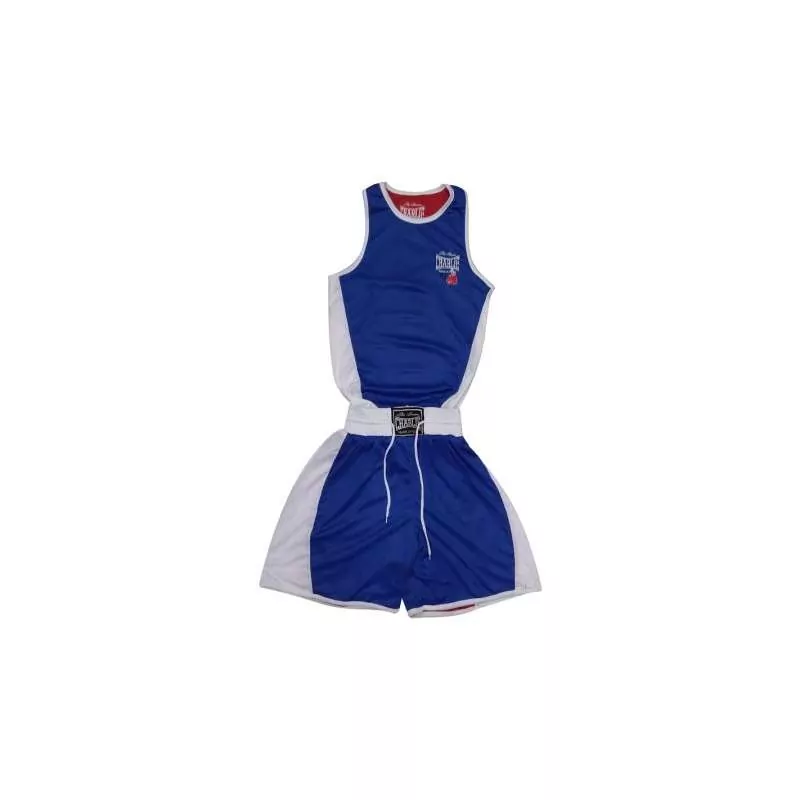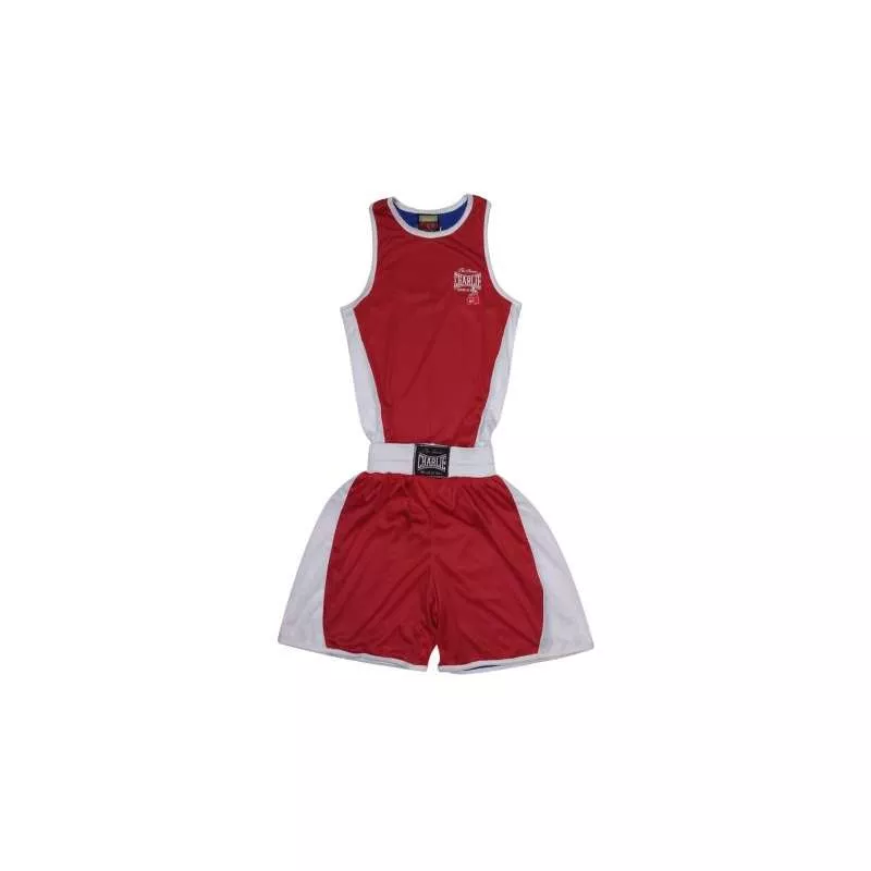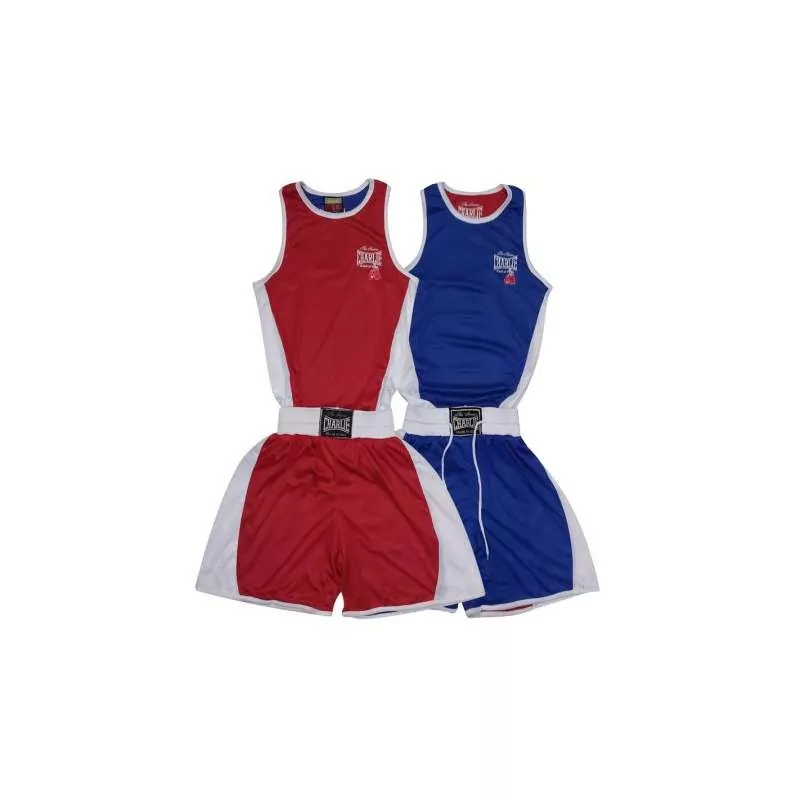 Caractéristiques: équipement de boxe Charlie en 100% polyester. Cet ensemble est composé d’un pantalon et d’un t-shirt réversible en fonction du coin choisi. Le pantalon est doté d’une ceinture élastique SANS cordon de serrage intérieur. Couleur rouge et bleu.