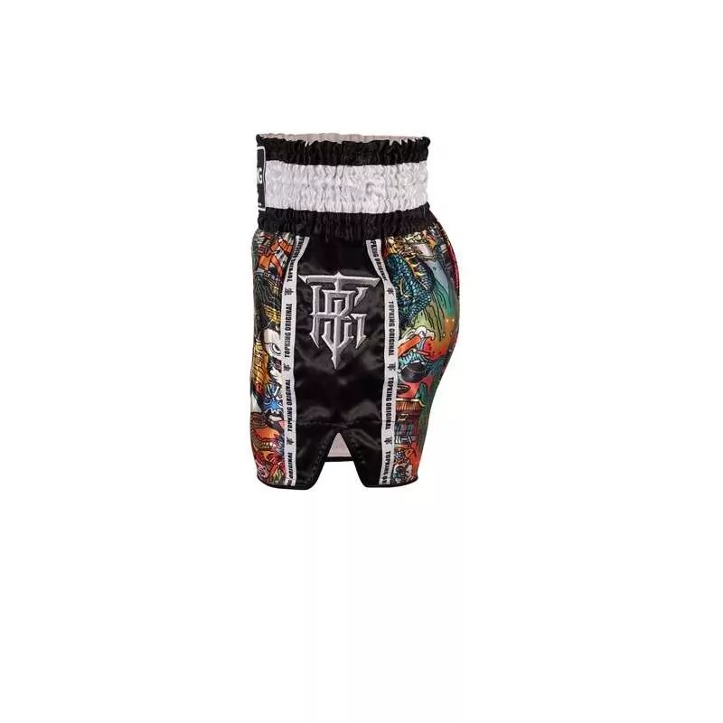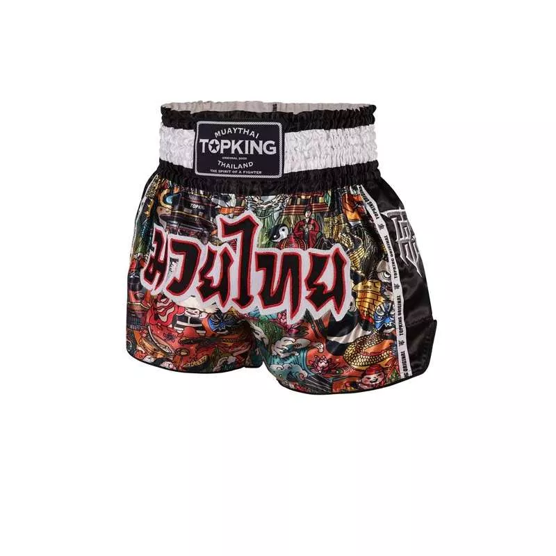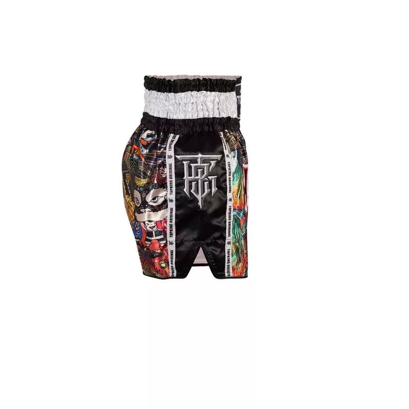 Caractéristiques: TopKing 226 short noir en satin qui se distingue par son impression originale par sublimation. Ceinture élastique où ressortent l’étiquette centrale avec le nom de la marque et quelques bandes noires, ainsi que les lettres thaïlandaises dans la partie centrale avant. Cordon de serrage intérieur pour un meilleur ajustement à la taille. Coupe thaïlandaise traditionnelle, courte et près du corps. Bandes latérales noires avec le nouveau logo gris de la marque. Ce pantalon muay thai est unisexe et fabriqué en Thaïlande.