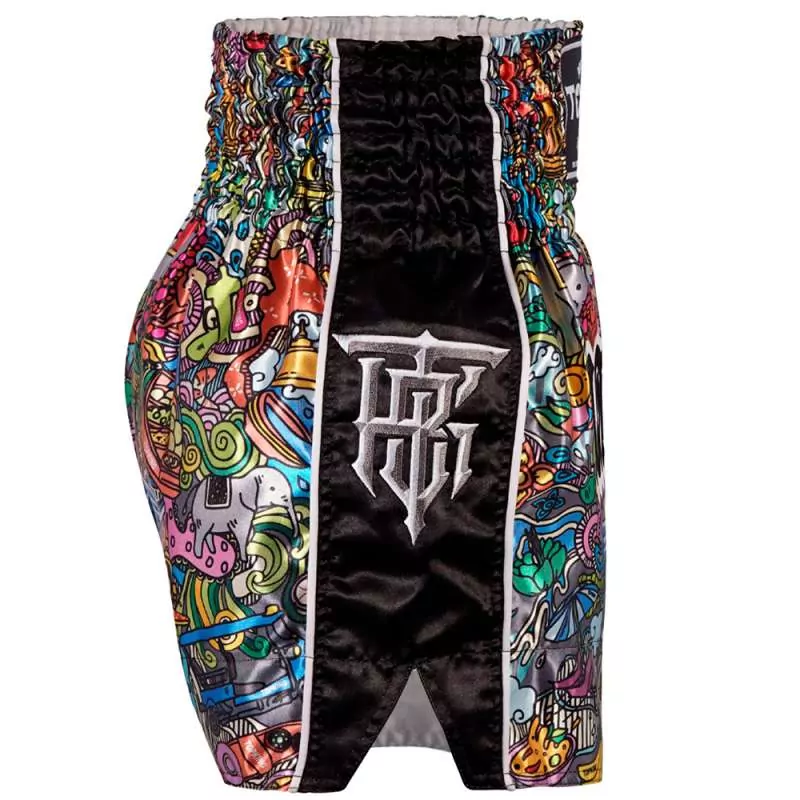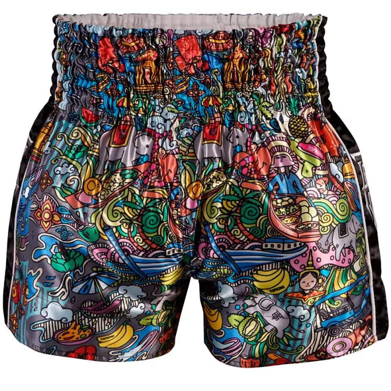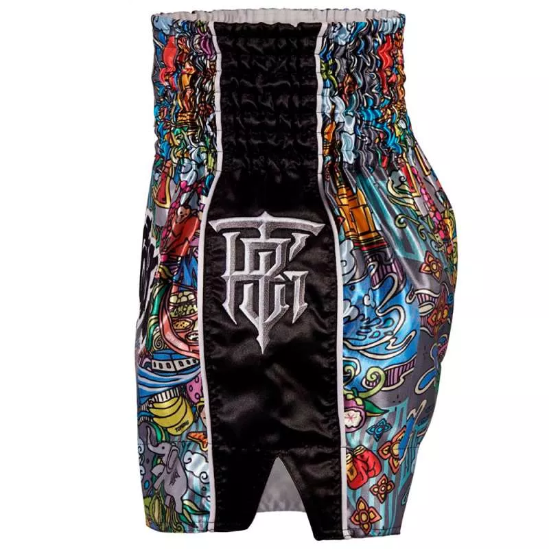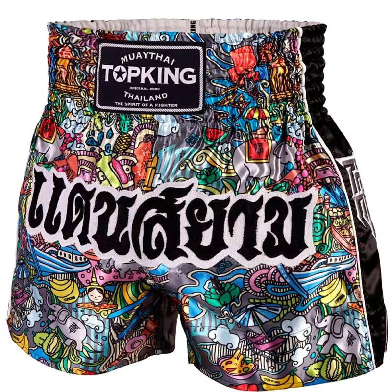 Caractéristiques: TopKing Boxing 225 short noir en satin qui se distingue par son impression originale par sublimation. Taille élastiquée avec étiquette centrale portant le nom de la marque. Cordon de serrage intérieur pour un meilleur ajustement à la taille. Coupe traditionnelle thaïlandaise, courte et ajustée. Bandes latérales noires avec le nouveau logo de la marque en gris. Lettres thaïlandaises en noir sur fond blanc. Ce modèle de pantalon muay thai est unisexe et fabriqué en Thaïlande.