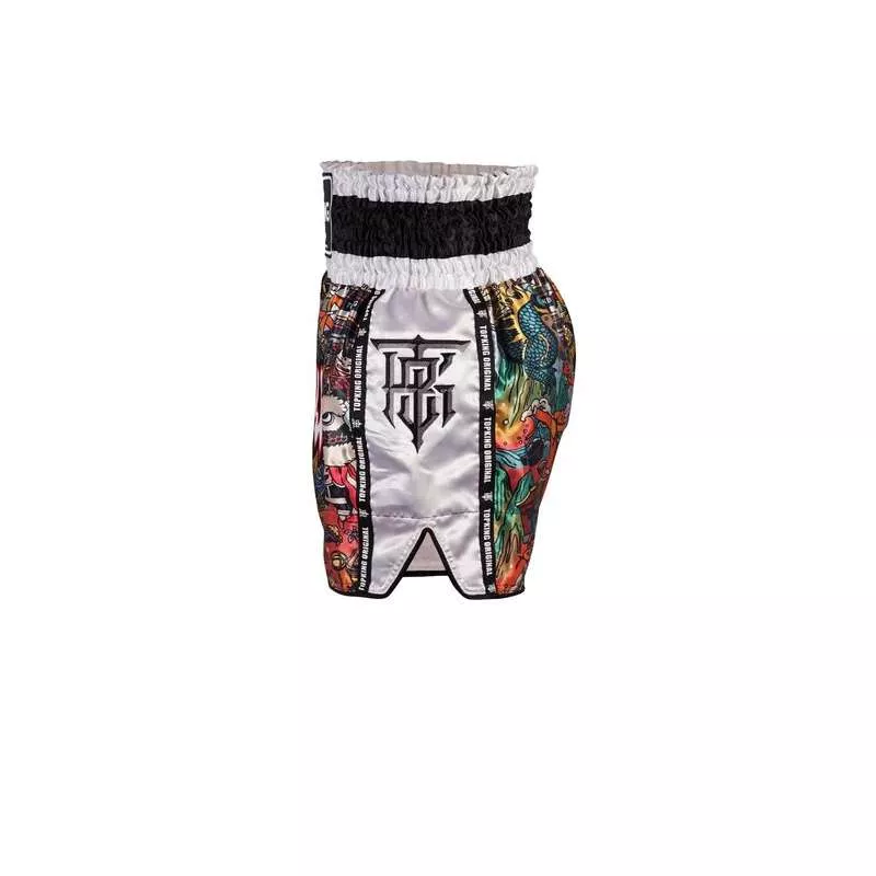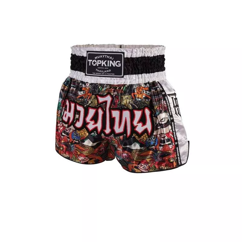 Caractéristiques: Short TopKing 226 blanc en satin qui se distingue par son impression originale par sublimation. Ceinture élastique où ressortent l’étiquette centrale avec le nom de la marque et quelques bandes blanches, ainsi que les lettres thaïlandaises dans la partie centrale avant. Cordon de serrage intérieur pour un meilleur ajustement à la taille. Coupe thaïlandaise traditionnelle, courte et près du corps. Bandes latérales blanches avec le nouveau logo gris de la marque. Ce pantalon muay thai est unisexe et fabriqué en Thaïlande.