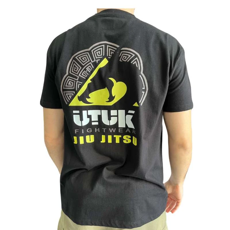 Caractéristiques: T-shirt Utuk jiu jitsu en 100% coton de haute qualité. T-shirt à manches courtes et col rond. Couleur noire. Dessins par sublimation pour garantir la durabilité de l’impression. Logo de la marque sur le devant et au dos le même logo avec les lettres de la marque et de l’art martial en jaune fluorescent et gris. Léger et très confortable.