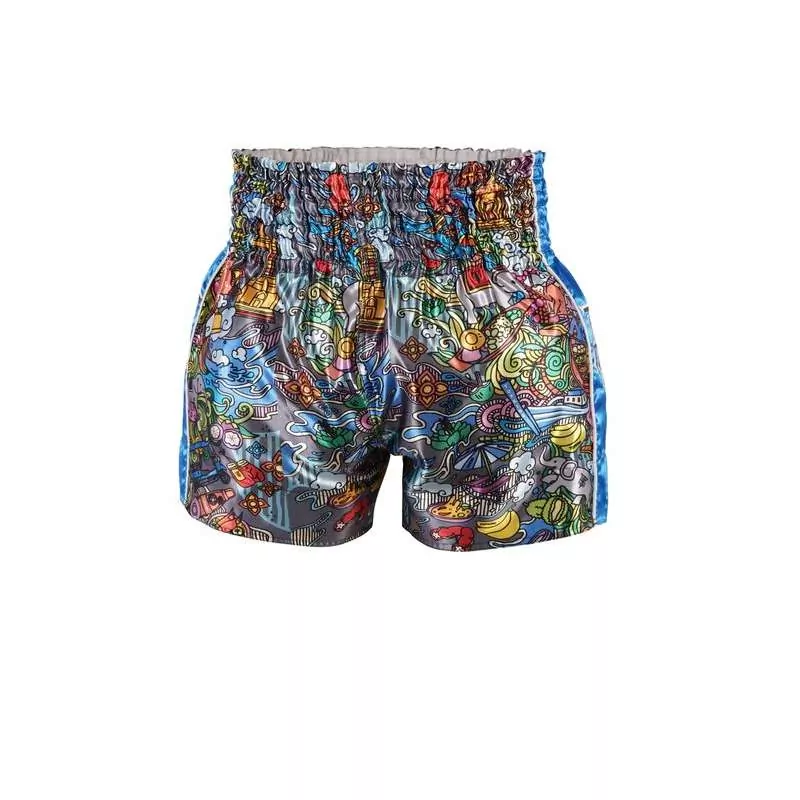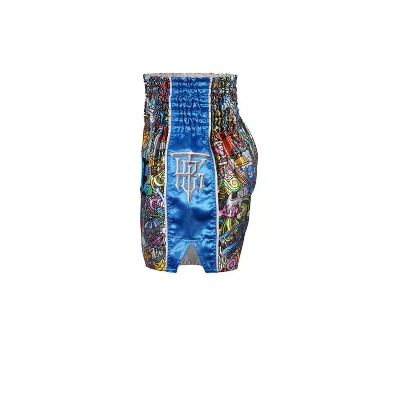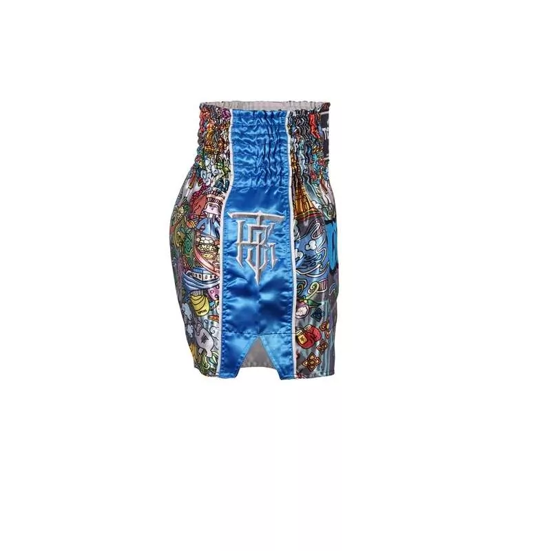 Caractéristiques: TopKing Short de boxe 225 bleu clair en satin qui se distingue par son impression originale par sublimation. Taille élastiquée avec une étiquette centrale portant le nom de la marque. Cordon de serrage intérieur pour un meilleur ajustement à la taille. Coupe courte et ajustée traditionnelle thaïlandaise. Bandes latérales bleu clair avec le nouveau logo de la marque en gris. Lettres thaïlandaises en bleu clair. Ce pantalon muay thai est unisexe et fabriqué en Thaïlande.
