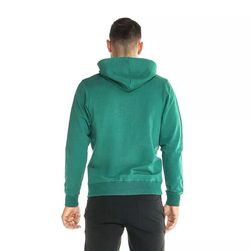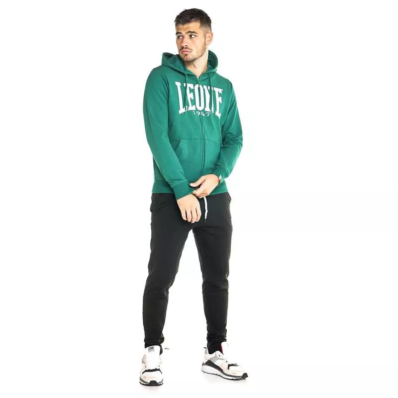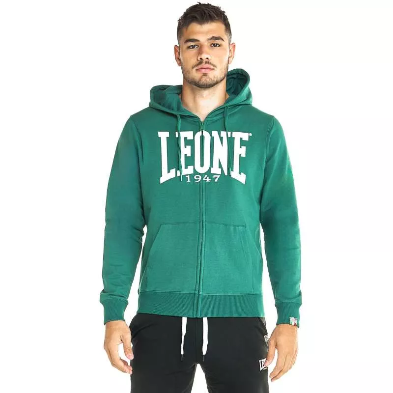 Caractéristiques: Sweat-shirt Leone en 92 % coton et 8 % élasthanne, vert foncé, avec logo de la marque en blanc. Fermeture à glissière en plastique et tirette personnalisée. Capuche avec cordon de serrage intérieur et œillets métalliques pour faire passer le cordon. Poches latérales. Étiquette sur les poignets du sweat avec le drapeau italien.